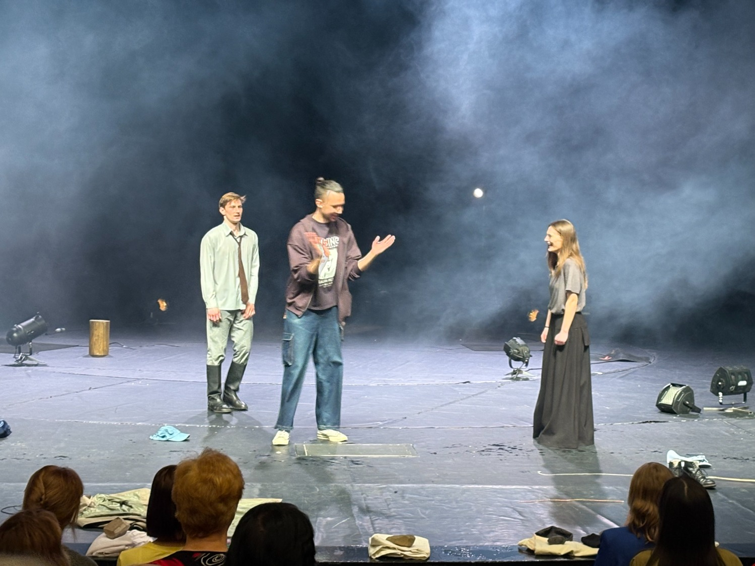 — Я не очень согласен с коллегами и со «скелетом», — начал он. — Гендерные отношения, вообще отношения на сцене — это очень важная вещь. Театр — это история всегда про людей. Но дело в том, что у людей бывают разные истории. Они бывают и негендерные. Здесь же история про хрупкость мира. Просто мир очень хрупок. Вот — мальчик чуть не умер, а вот он живой, вот — герой приехал в деревню за одним, а увидел другое, вот Марфа — живая, но смерть близко, вот ясное небо и вдруг его заволокло тучами. Суть — в этой текучести мира, в этой его хрупкости, и мы ею заразились.